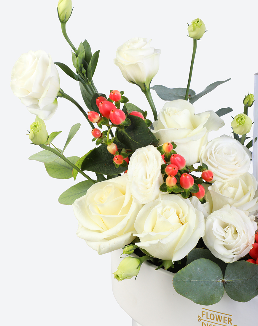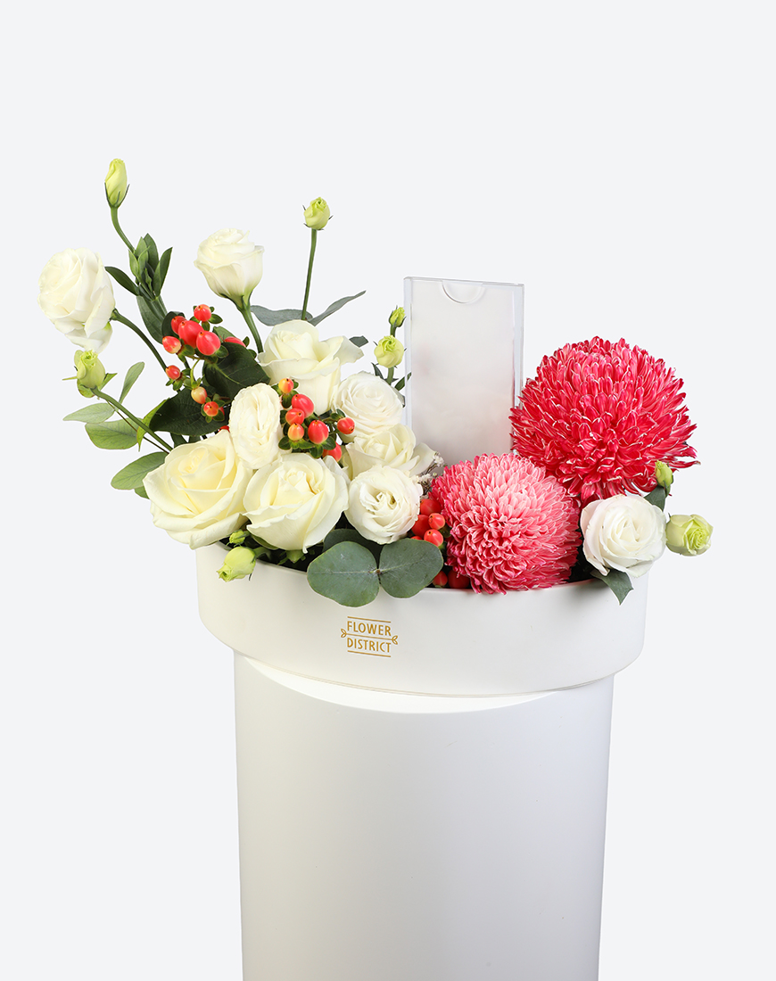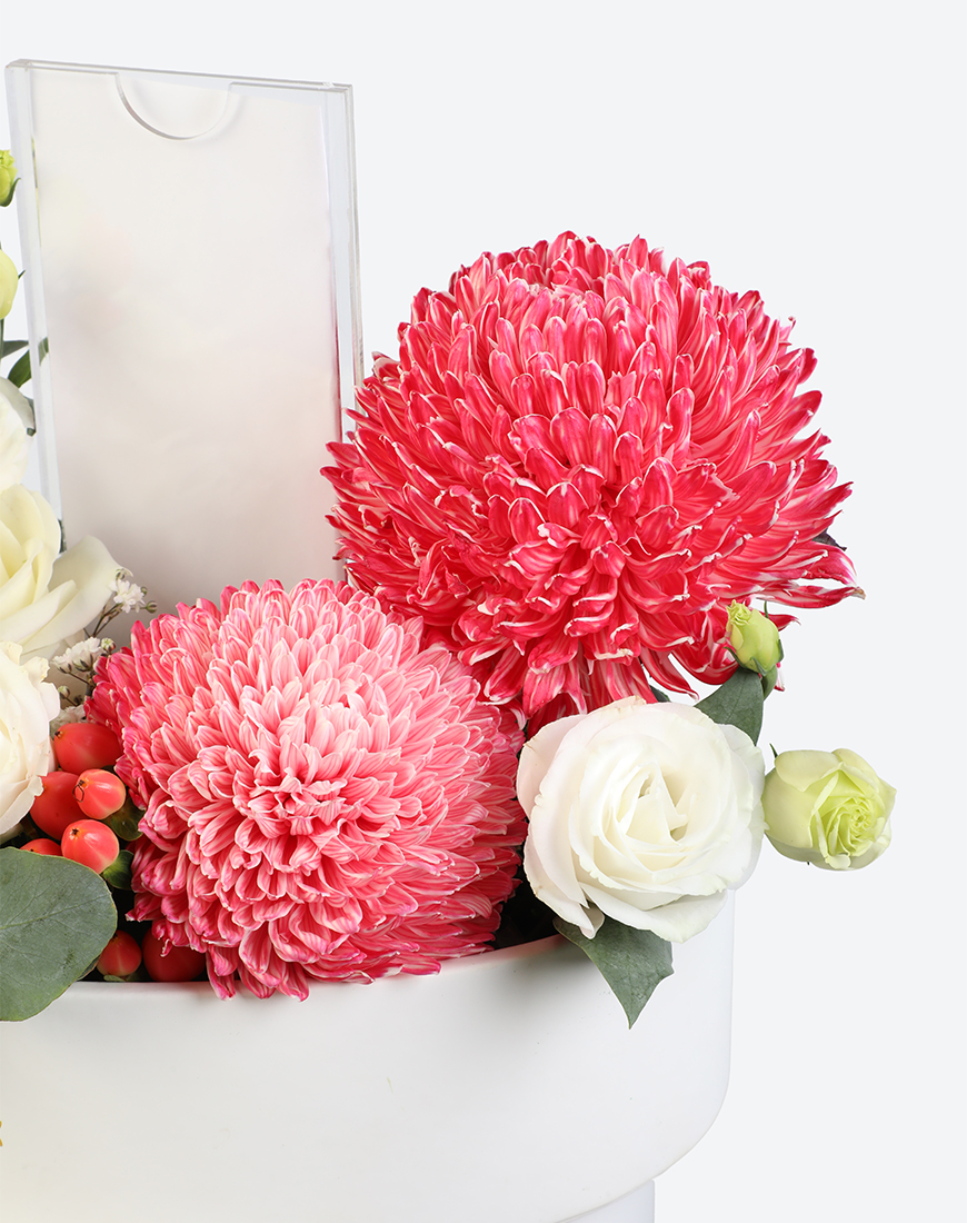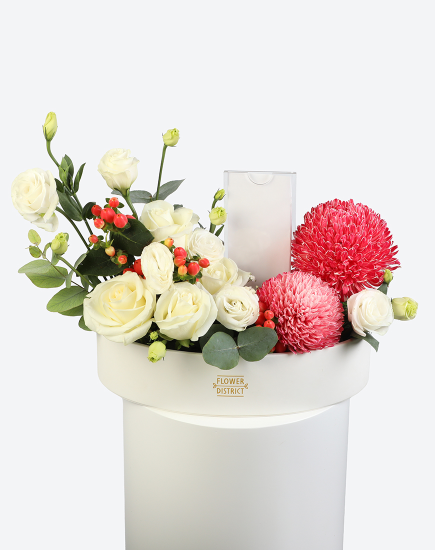 The Blush Harmony Leather Tray with Money Box brings together elegance and freshness. Designed with soft tones of pink and white, it combines lisianthus, roses, and peonies with lush greenery. Accented with a sleek money box, this arrangement makes a perfect gift for special occasions or sophisticated interiors.