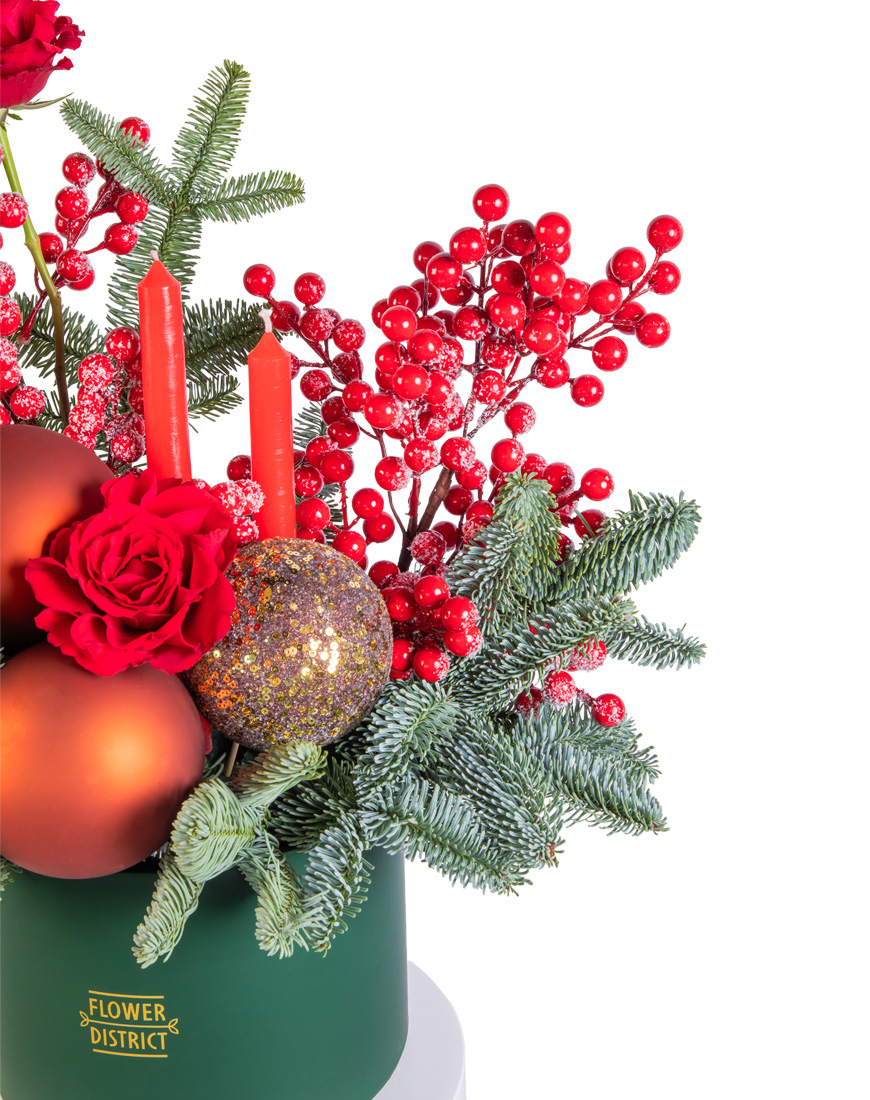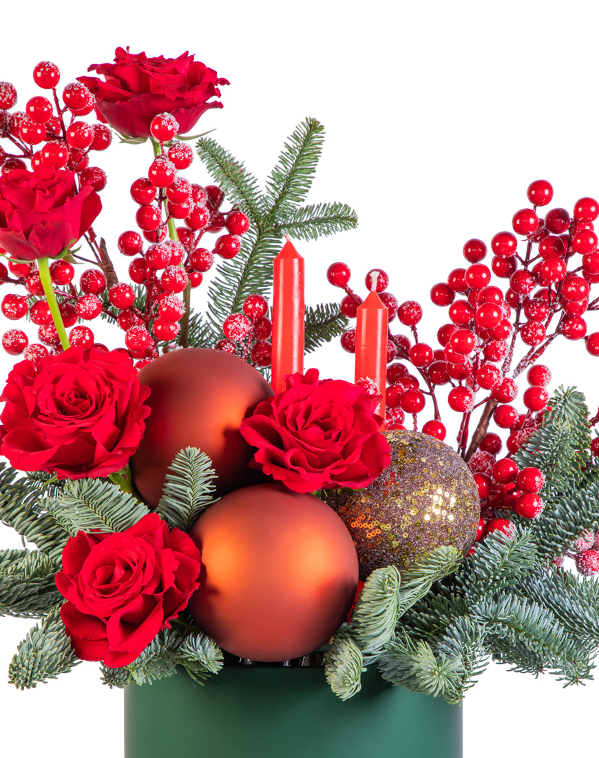 The addition of DF berry stems introduces soft texture and fullness, while 3 festive Christmas balls add a touch of sparkle and celebration. Two elegant candles rise from the center, completing the design with a soft, glowing ambiance that embodies the spirit of Christmas.