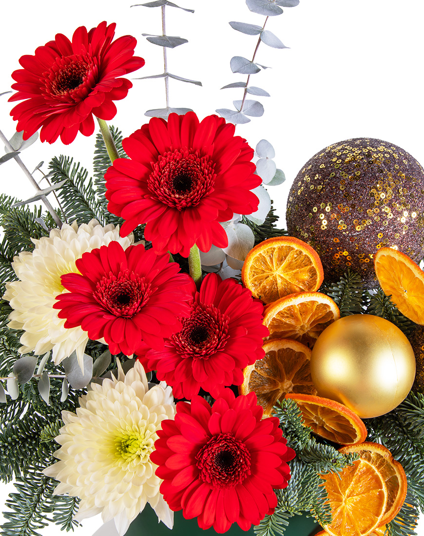Celebrate the season with style through our Christmas Golden Frost Special Flower Arrangement, a festive masterpiece that blends vibrant florals with elegant winter textures. The arrangement begins with 5 striking gerbera blooms and 2 chrysanthemum specials, creating a warm and joyful color palette perfect for the holidays.