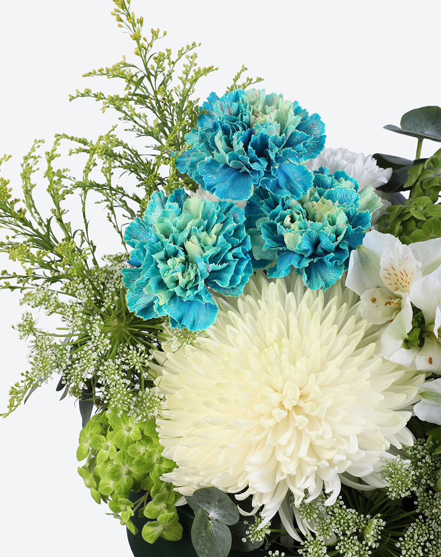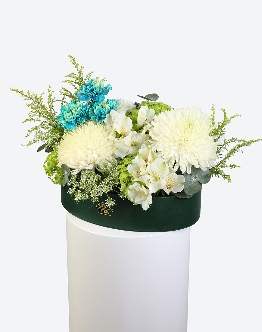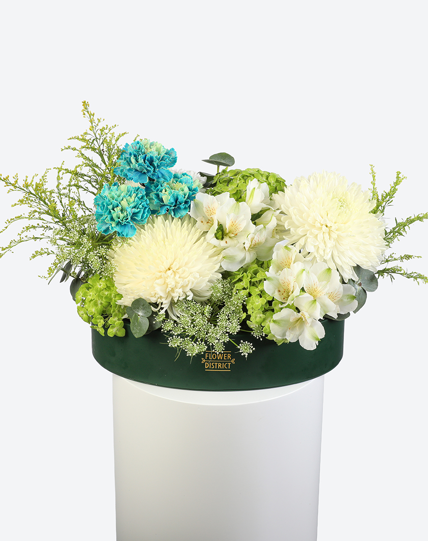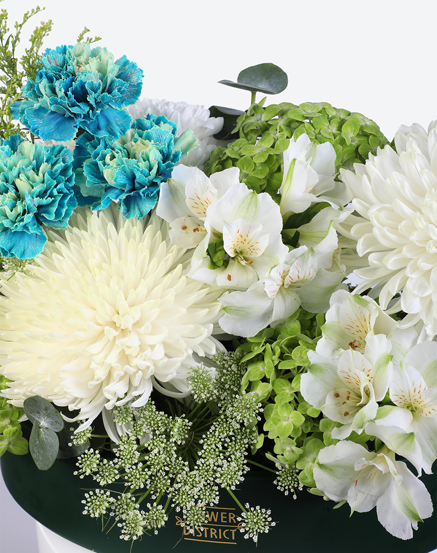 The Emerald Glow Leather Tray Arrangement captures the essence of nature’s freshness. With bright greens and soft whites, it blends hydrangea, alstroemeria, and chrysanthemums to create a lively, balanced composition — a statement of elegance that brings vibrance to any modern space.