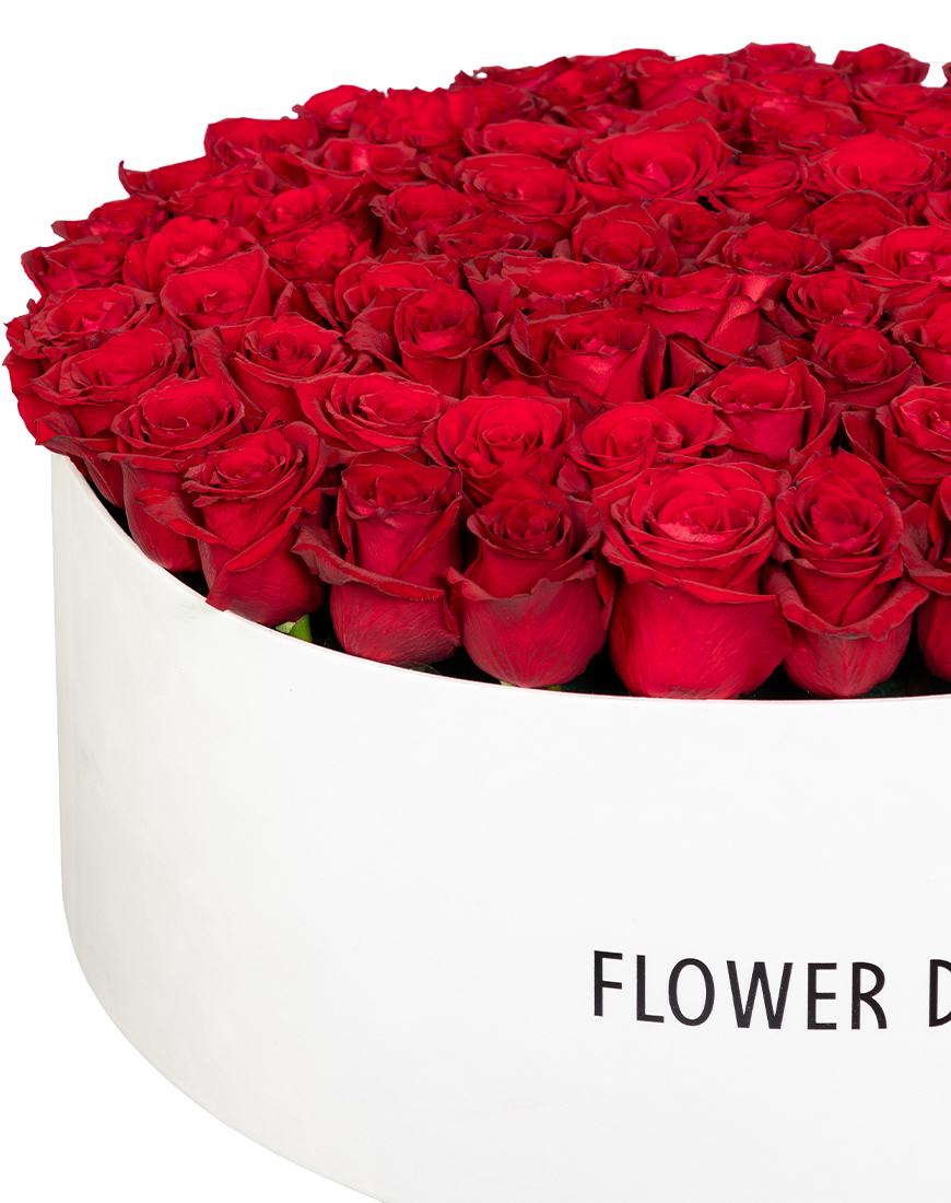Designed to make a striking Valentine's Day impression, this flower box is filled with lush red roses arranged neatly in a signature white round box.