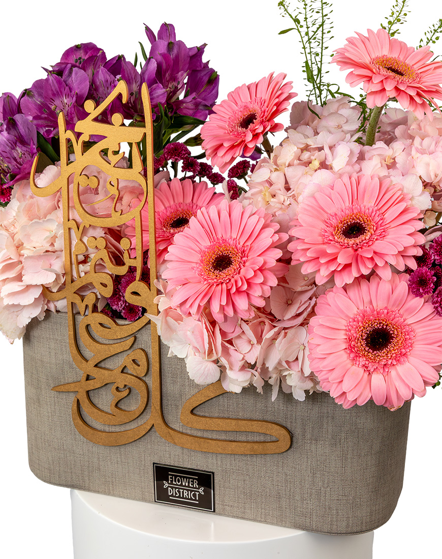 Crafted to celebrate Ramadan with richness and color, this Ramadan Special Flower Arrangement is arranged in a premium leather vase and features a balanced mix of hydrangea, chrysanthemum, gerbera, lepidium, and alstroemeria. Finished with an acrylic Ramadan Kareem Arabic topper, it creates a festive and welcoming statement suitable for gifting or display during the holy month.