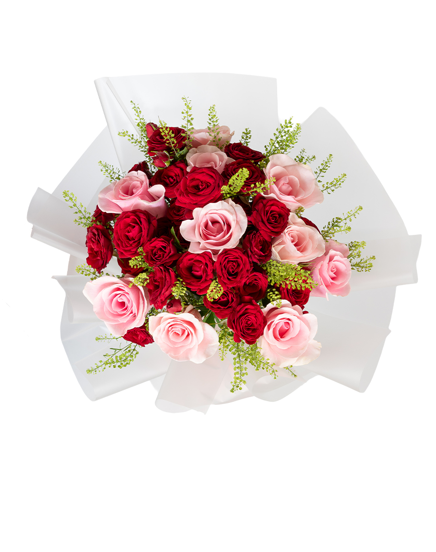 Soft and charming, this Valentine's Day mixed bouquet combines pink roses with red spray roses.