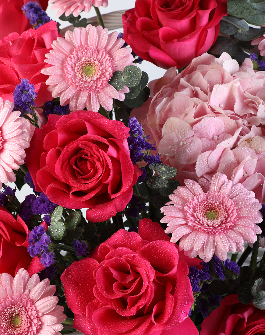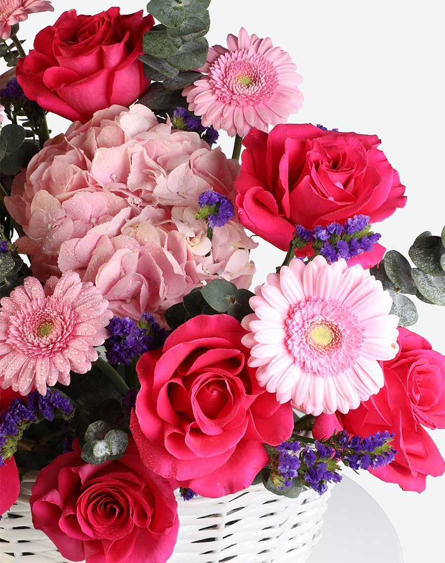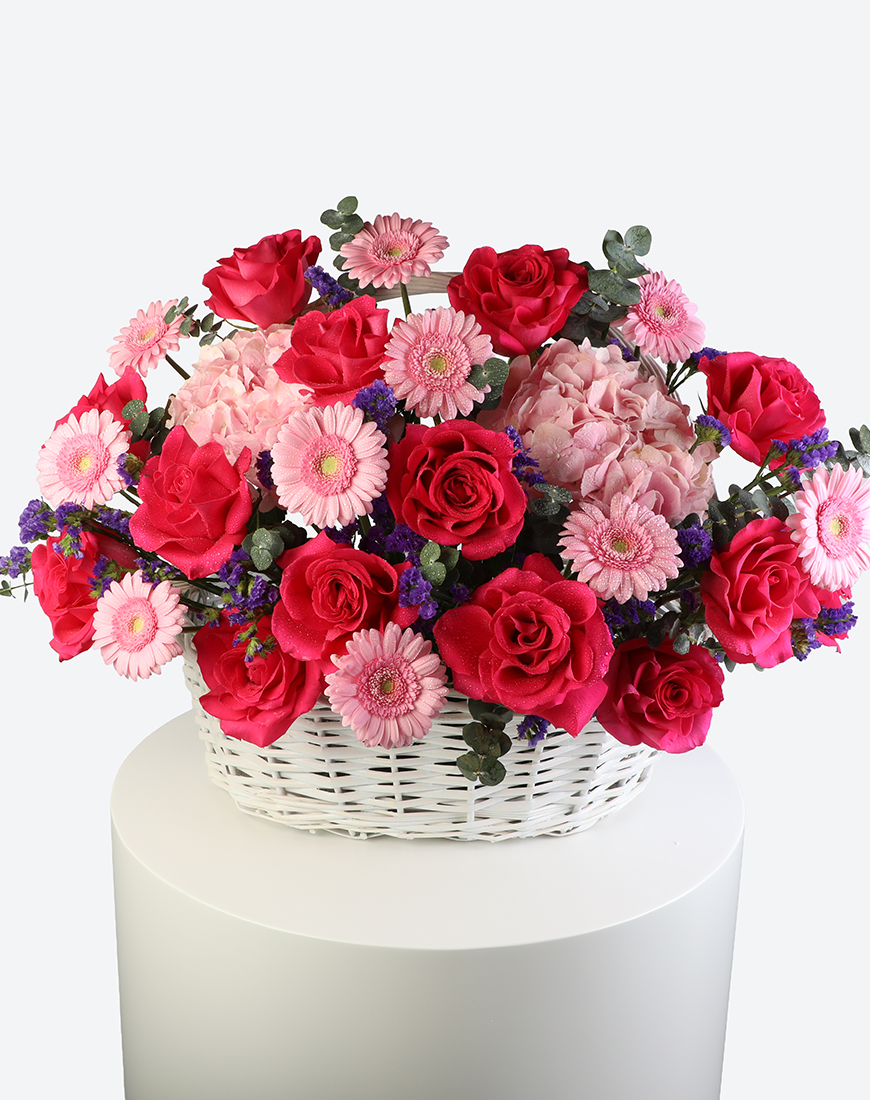 The Grand Romance Large Flower Basket captures the essence of love and celebration. Overflowing with Ecuadorian roses, gerberas, and soft pink hydrangeas, it’s accented with static and eucalyptus for texture and balance. Perfect for grand gestures, festive occasions, or stunning centerpieces.