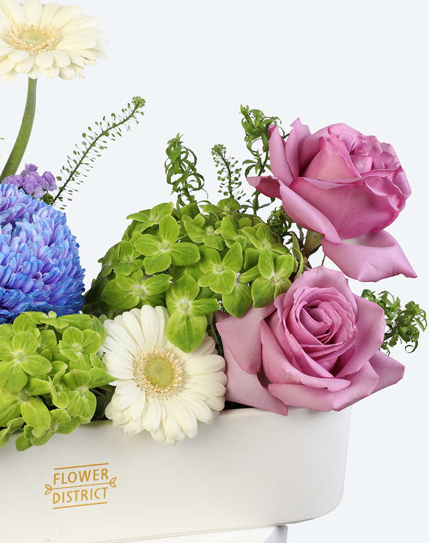 The Lavender Dream Leather Tray captures the soothing charm of pastel hues and lush textures. Delicate Ecuador roses, green hydrangeas, and blooming mattiolas are paired with soft gerberas and peonies to create a tranquil floral statement. Ideal for gifting or bringing serenity to your living space.