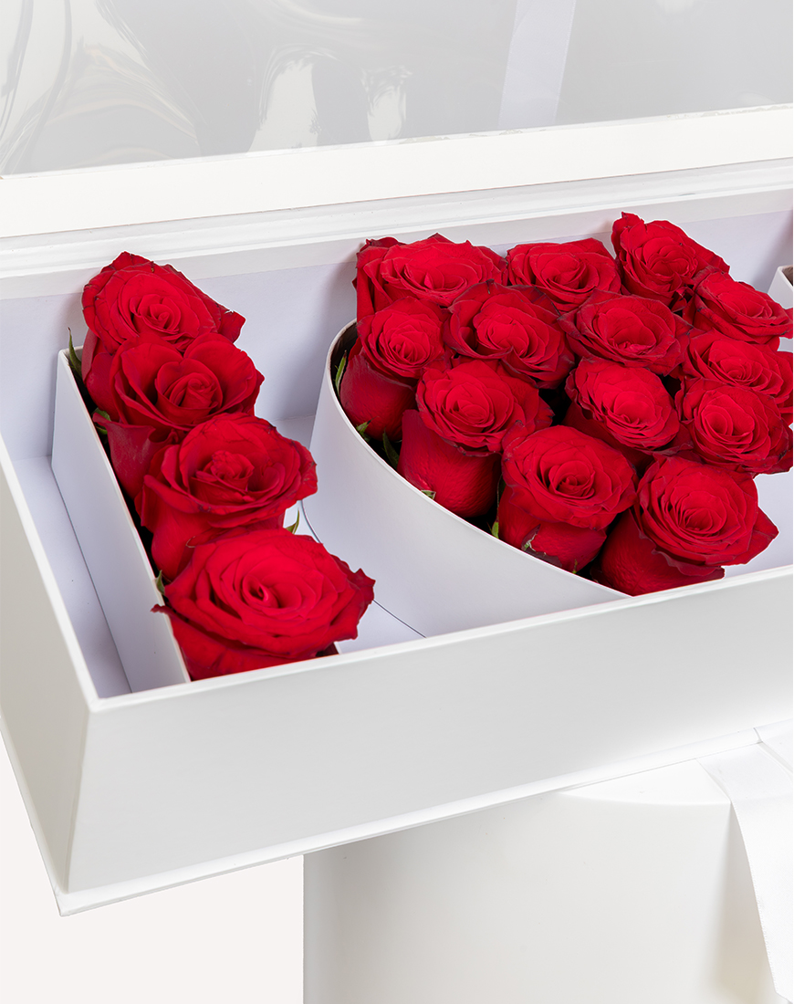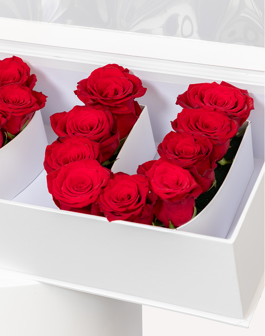 Crafted to express affection in a bold and meaningful way, this Valentine's Day flower box features red roses arranged to spell LOVE U.