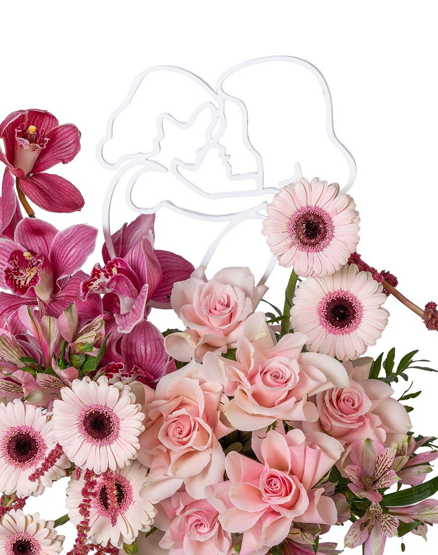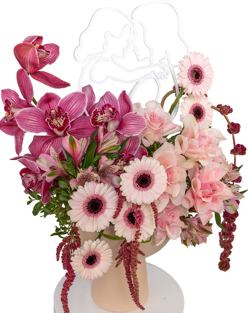 This Large Mothers Day vase arrangement blends soft Pink Roses and vibrant Gerbera with elegant Cymbidium orchid and flowing Amaranthus details. Designed in a modern vase with Mothers Day acrylic accent, it creates a graceful and expressive floral gift symbolizing appreciation and love.