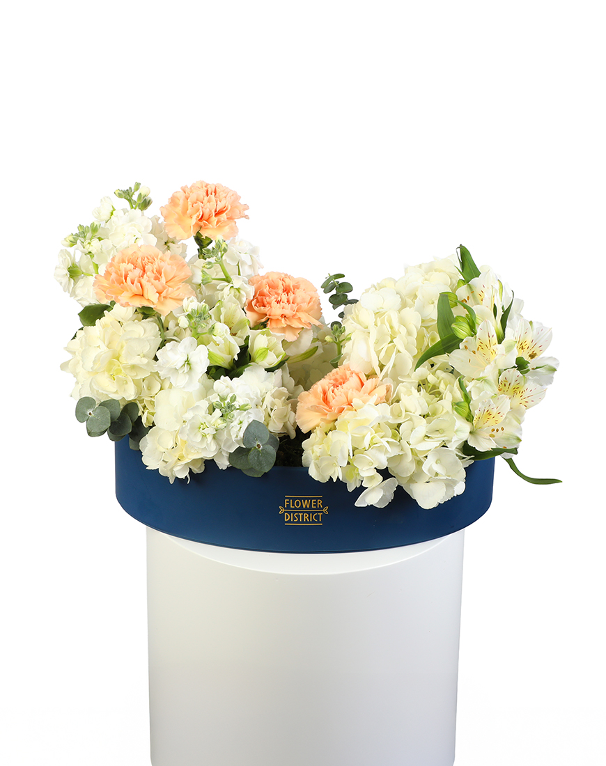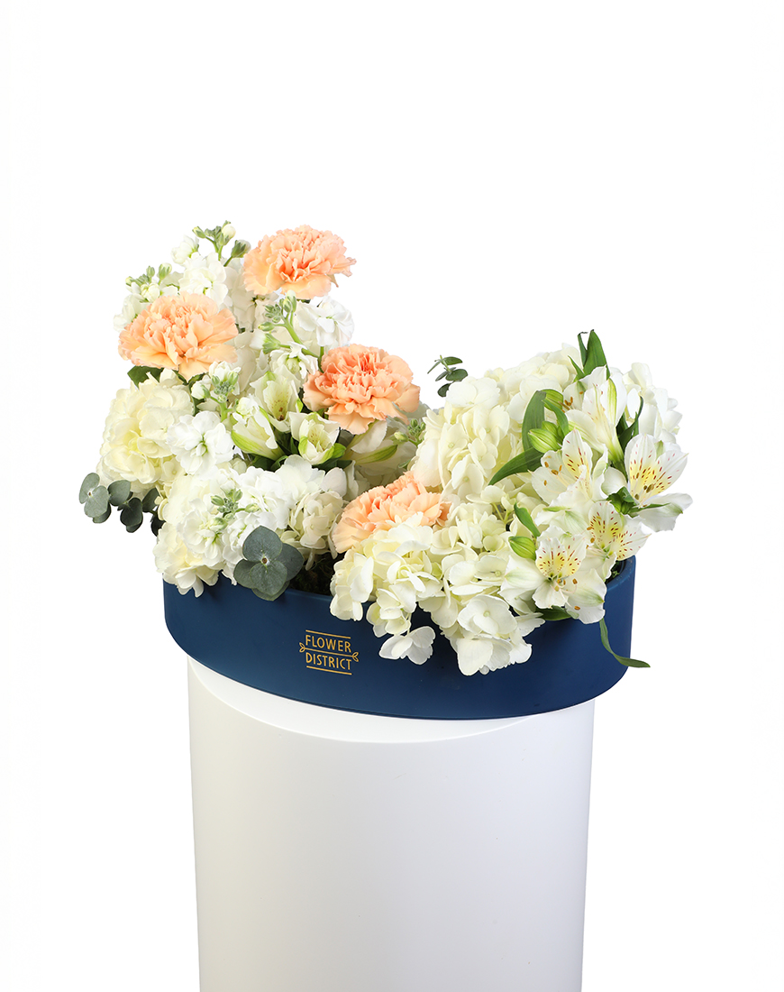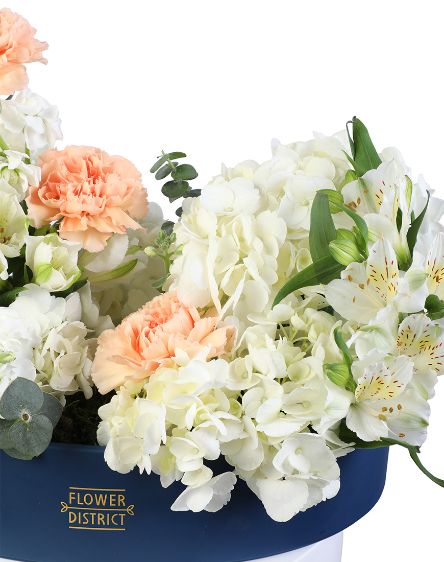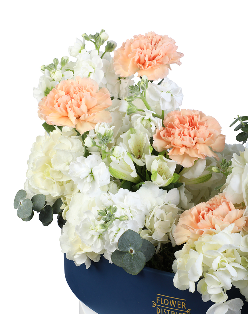The Peach Bloom Leather Tray Arrangement radiates elegance and serenity. A balanced blend of peach carnations, white hydrangeas, and fragrant matthiola rests atop lush eucalyptus, presented in a premium leather tray. Perfect for gifting or decorating, this arrangement exudes modern sophistication and natural beauty.