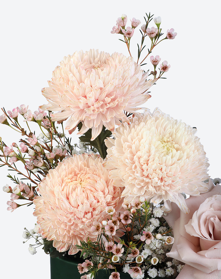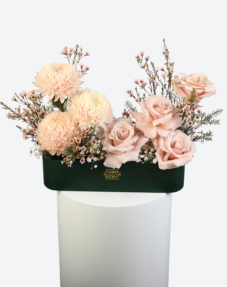 The Peach Whisper Leather Tray exudes warmth and tenderness through its gentle peach palette. Ecuador roses and chrysanthemums blend seamlessly with delicate wax flowers and gypsophila, forming a refined arrangement that adds a touch of calm sophistication to any interior.