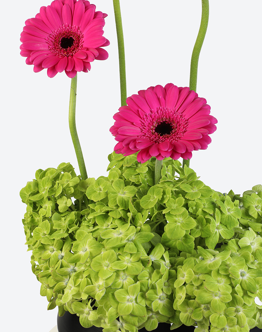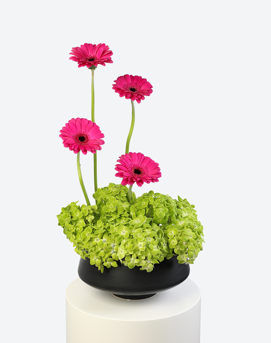 The Pink Tower Flower Vase is a modern display of charm and simplicity. With vivid pink gerberas rising elegantly over lush hydrangea greens, it forms a balanced statement of freshness and beauty. Perfect for minimalist interiors or as a bright, joyful gift.