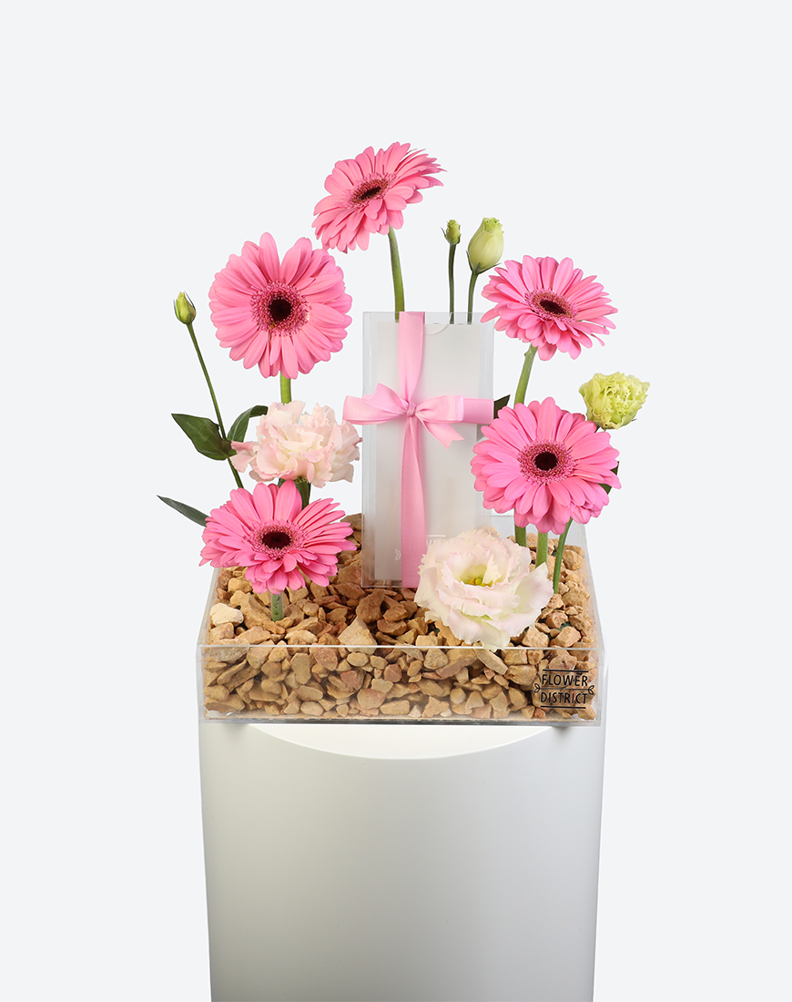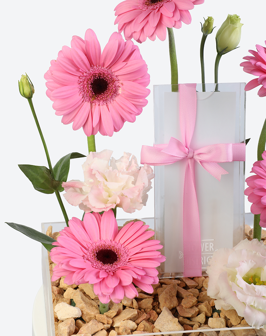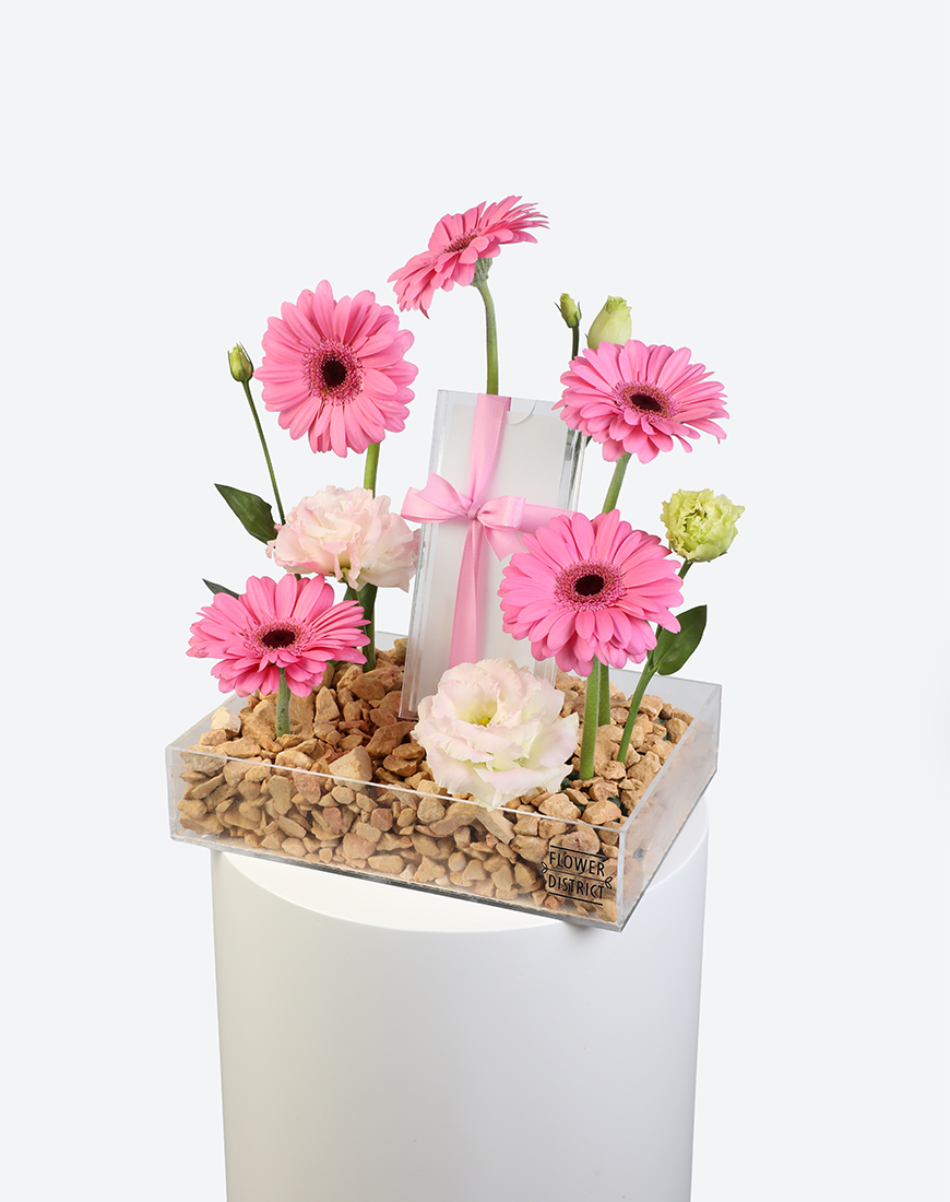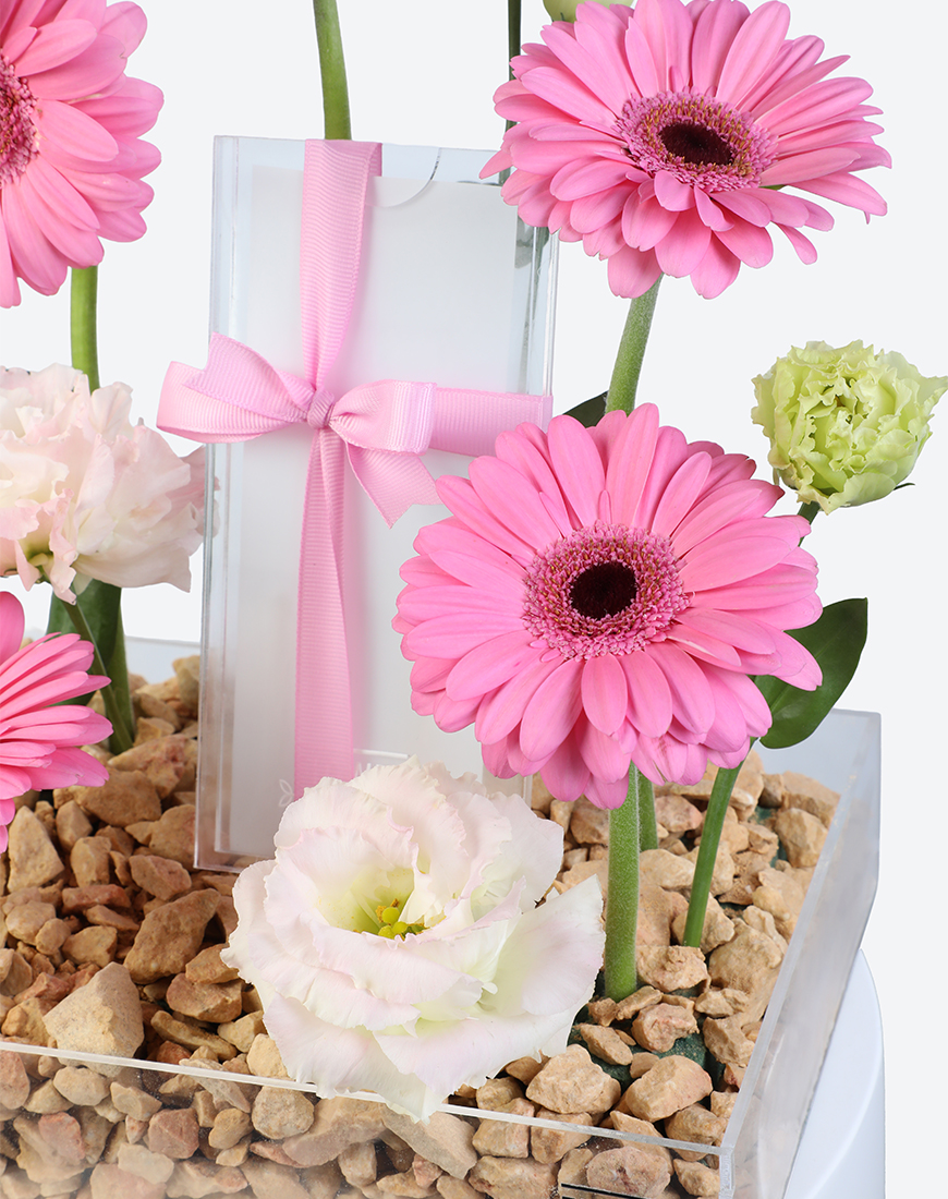 The Pink Whisper Small Acrylic Tray with Money Box blends elegance with sweetness. Delicate pink gerberas and lisianthus bloom in harmony, complemented by a subtle money box for a refined touch. Perfect for birthdays, baby showers, or heartfelt occasions.