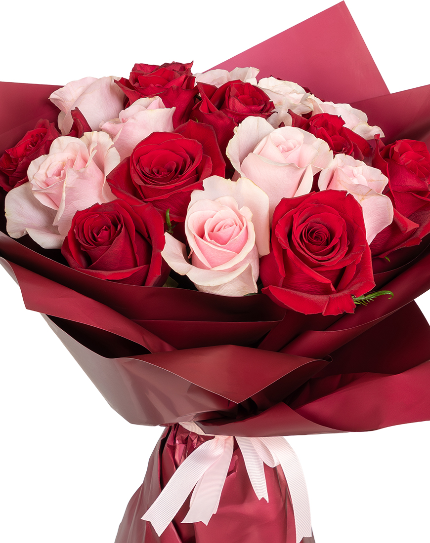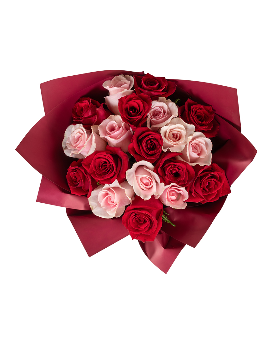 This Valentine's Day bouquet offers a balanced blend of red and pink roses arranged to express love.