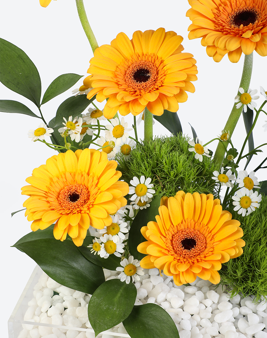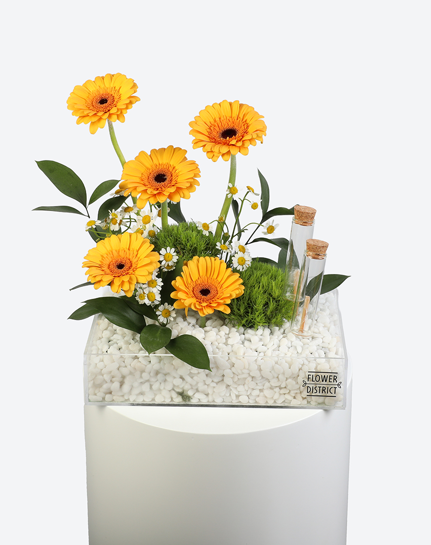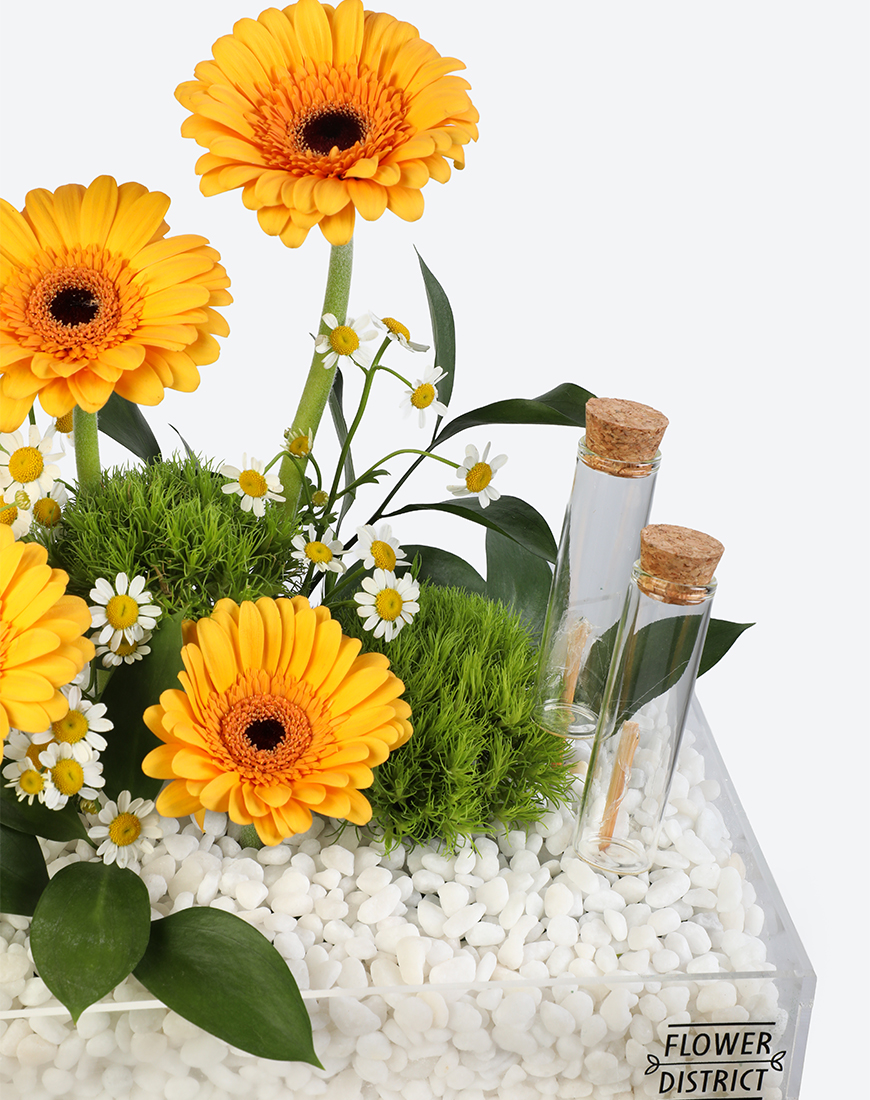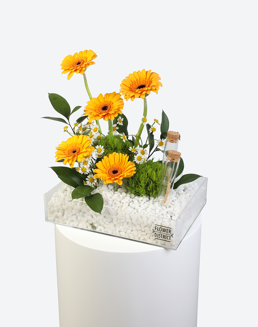 The Sunny Glow Small Acrylic Tray with Money Tube is a vibrant expression of warmth and happiness. Yellow gerberas bloom brightly among delicate white tanacetum and lush greens, beautifully complemented by elegant money tubes. Ideal for thoughtful gifting or adding a joyful accent to modern interiors.