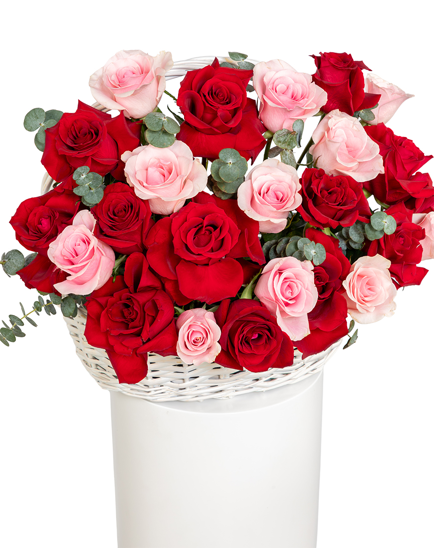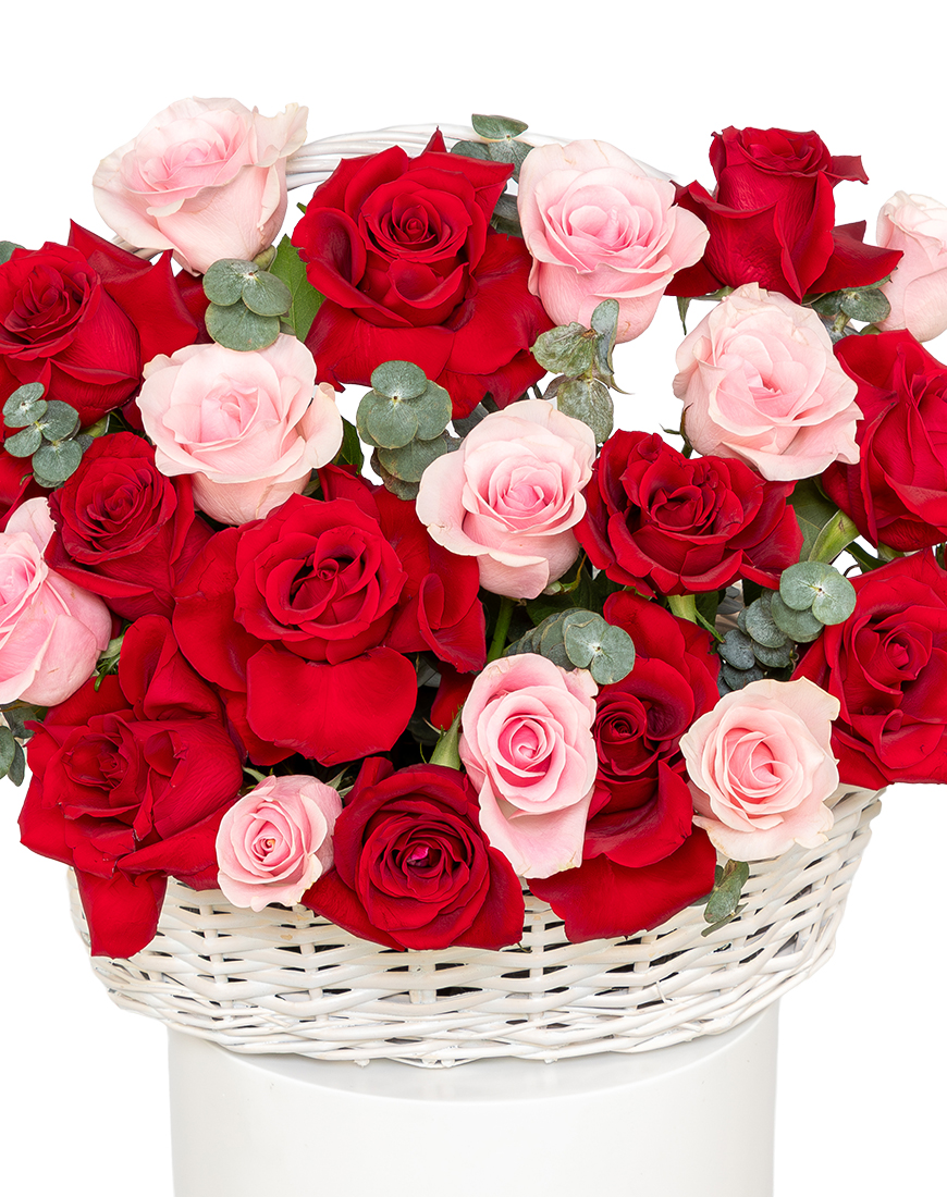 A charming expression of love, this medium Valentine's Day basket arrangement combines vibrant red roses with delicate pink roses in a beautifully woven willow basket.