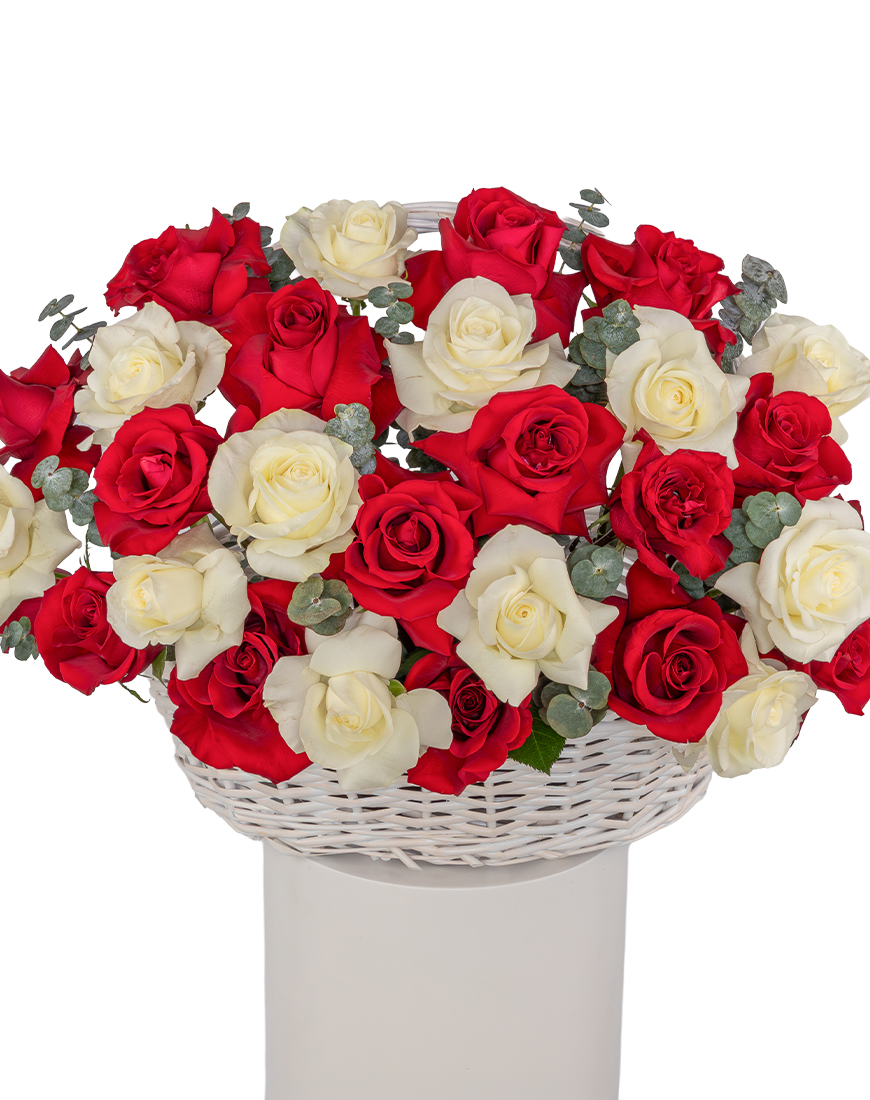 This Valentine's Day basket arrangement blends red and white roses with fresh eucalyptus to create a balanced and elegant floral design.