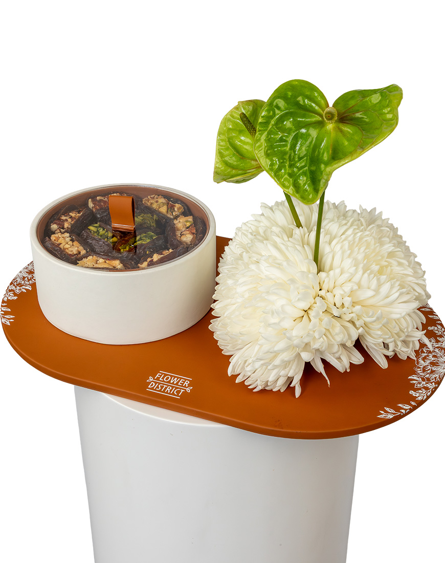 Designed with simplicity and balance in mind, this Ramadan Special Flower Arrangement pairs soft white floral tones with a refined brown leather dates tray. The combination of chrysanthemums, anthurium, and dates creates a calm and elegant presentation suitable for Ramadan gifting and table décor.