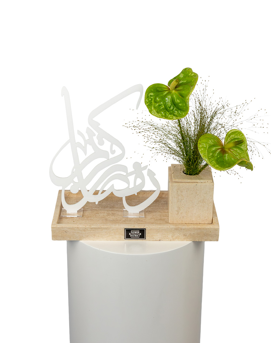 Verdant Grace Ramadan Special Flower Arrangement presents a calm and refreshing composition placed on a marble base. The combination of anthurium and subtle greens creates a serene decorative piece suitable for Ramadan settings and thoughtful gifting.